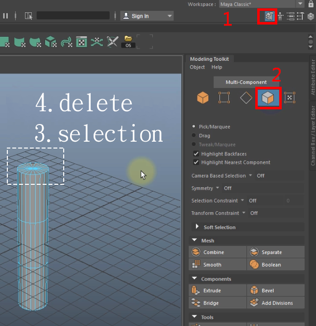 According to the step on the image:1.Open the modeling toolkit 2.Switch to the face mode 3.Select the parts you don’t need 4.Delete them.