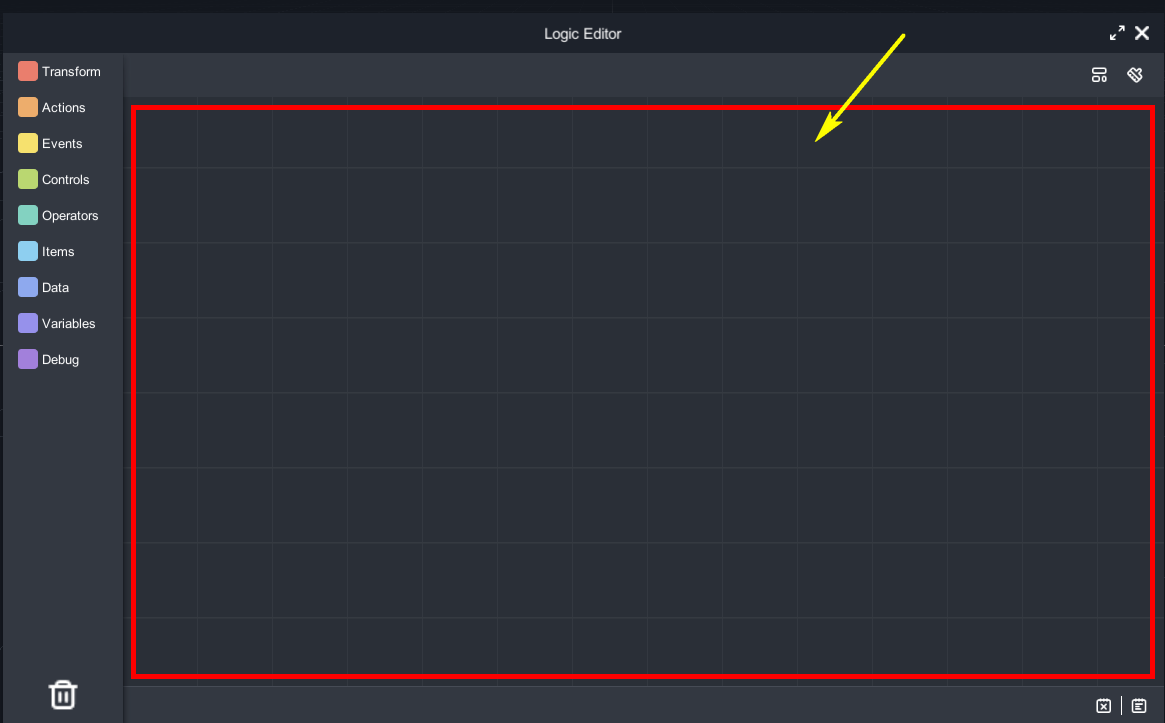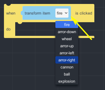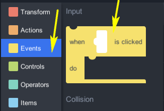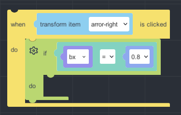 1. Click and drag “Events” > "when…is clicked". Choose “arror-rijgt”for the transform item.