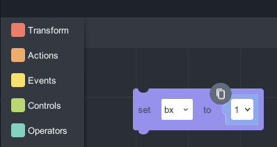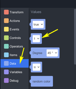 3. Click ”Data” > “1”, and drag it to the bx blockly’s right side. Edit value to 0.