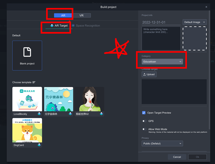 Create a AR Target project. It’s necessary to select a category in latest editor.