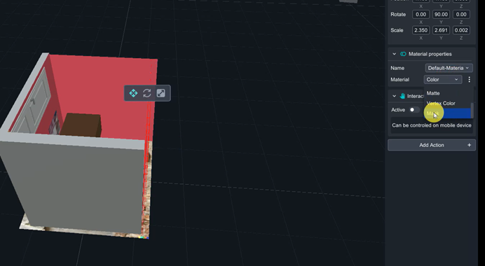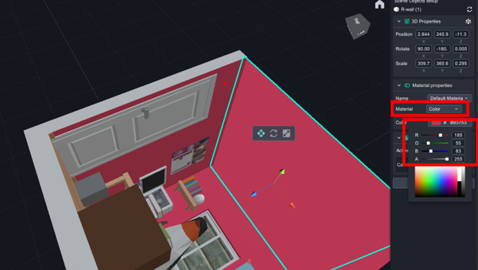 Set flat square as wall of the room, change its material into【color】, RGB=(185, 55, 83).