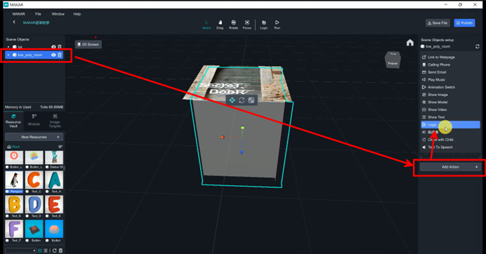 Select the room and add action, and add Logic function on it,
