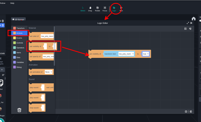 Click the logic on the top banner, you can turn on logic editor, select 【Action/ set visibility of ______to _____ 】, drag the blockly to the scene, and you just solve it.