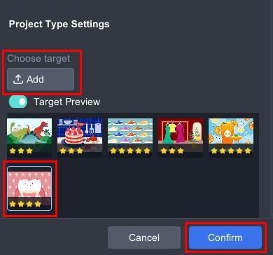 3. In the right side project type settings column, click "Add" to upload a JPG image to add your image target. All uploaded image targets will be previewed here in the future. After selecting an image, click "Confirm."