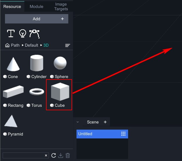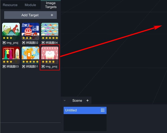 | Method 1: Drag an image target from the resource into the scene. | Method 2: Click scene objects, and on the right side, select "Augmented Reality (Image)" from the drop-down menu. Then select the image target from the resource and click "Confirm". |