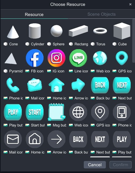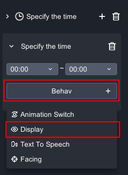 4. Click "Behav" to choose from four functions: "Animation Switch, Display, Text To Speech, Facing" The example below uses "Display" Select the object in the scene.