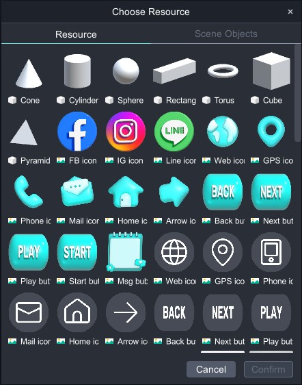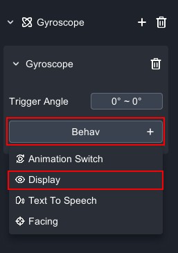 4. Click "Behav" to choose from four functions: "Animation Switch, Display, Text To Speech, Facing" The example below uses "Display" Select the object in the scene.