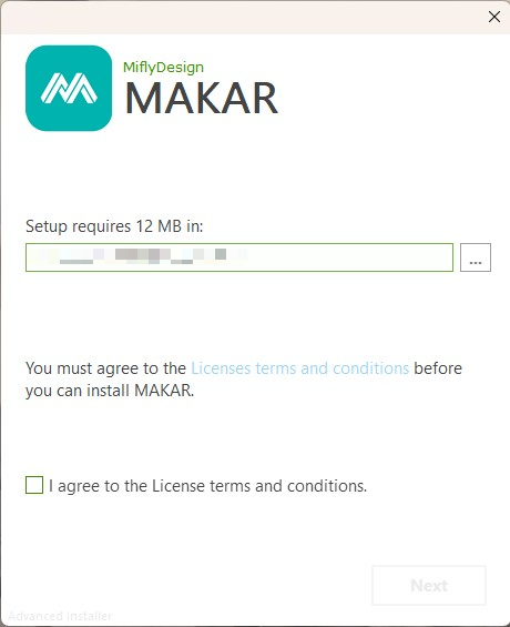 | 1. After opening the installation file, MAKAR installation screen will appear. | 2. Select the installation destination and check "I agree to the License terms and conditions." then click "Next". |