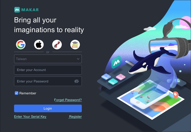 MAKAR offers third-party login options, allowing you to quickly finish signing up by logging in at the same time. You can log in using third-party accounts either from MAKAR Login on the official website or the login screen within the MAKAR Editor.