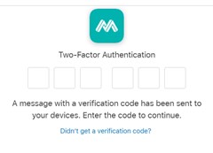 1. Click Apple icon to access the login screen and enter your login information. 2. Logging in with Apple requires "Two-Factor Authentication." Please verify and input the authentication code on your Apple device.