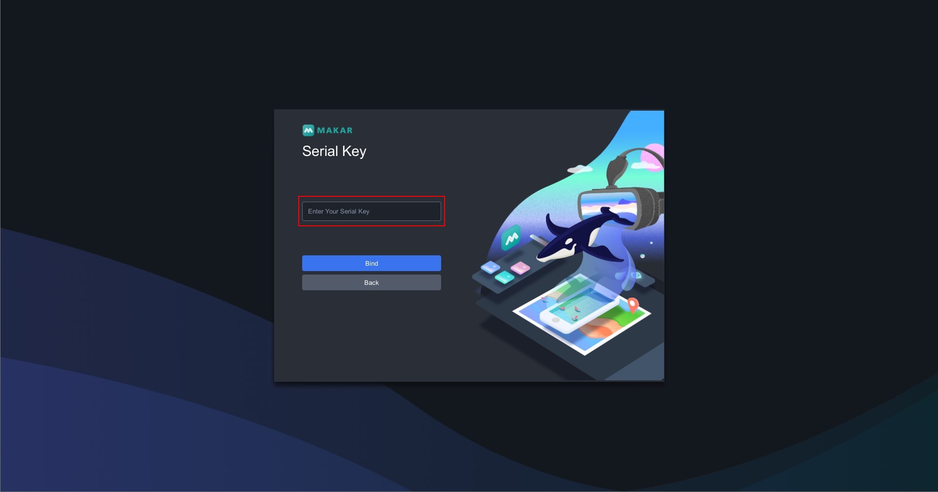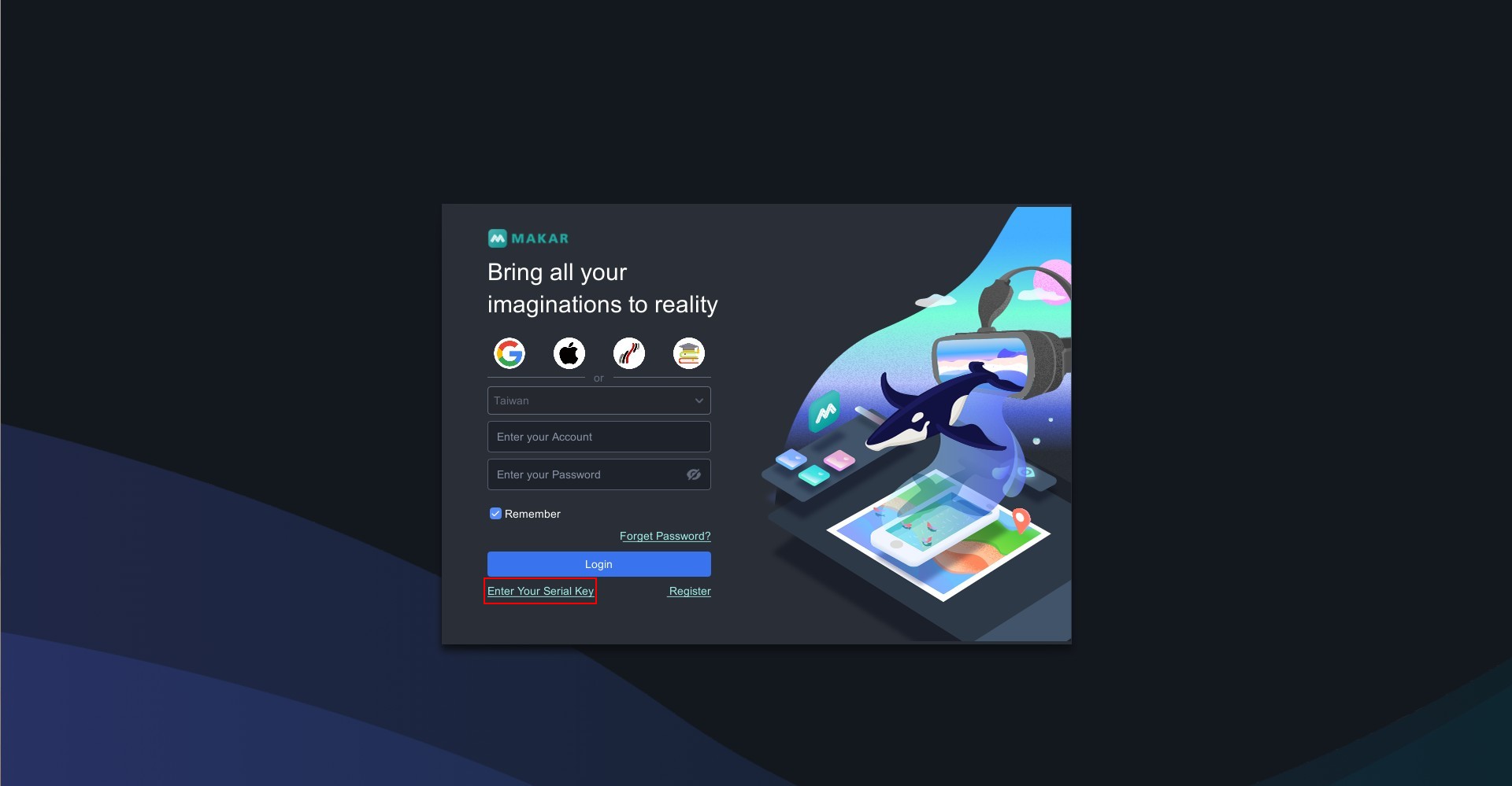 1. Open MAKAR Editor and go to the login page. Click "Enter Your Serial Key" at the bottom left corner.