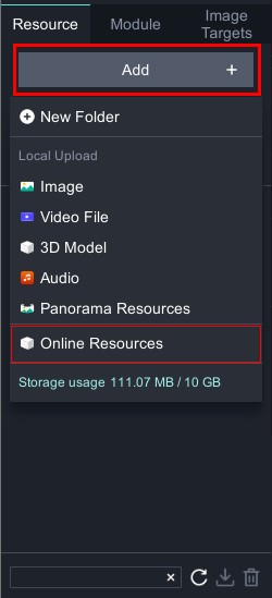 Click "Add" on the left-side resource library to upload images, videos, 3D models, audios, and panorama images.