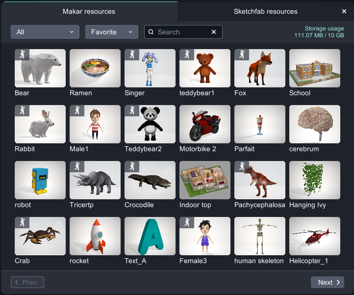Click "Online Resources" in the left-side resources, providing access to the MAKAR resources and Sketchfab resources. Click "替代文字" to view assets, and click "替代文字" to download models.