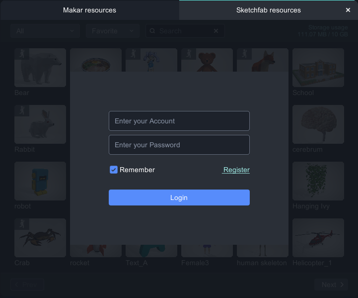 1. In the MAKAR resources, click "替代文字to view assets, and click "替代文字" to download models. 2. To access the Sketchfab resources, you need to register an account and log in. Click "Register" to register.