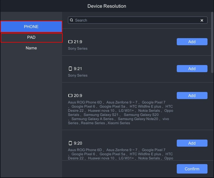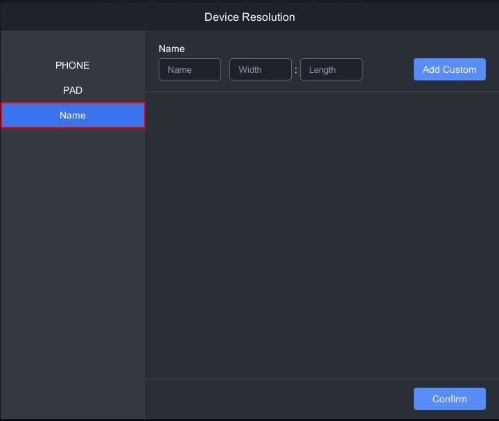 2. You can directly add sizes under "PHONE" or "PAD" categories, or add custom sizes under "Name".
