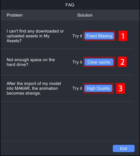 If you encounter common issues with assets while using MAKAR Editor, you can click on "Help → FAQ" to open the FAQ window, which will explain possible resources issues and solutions.