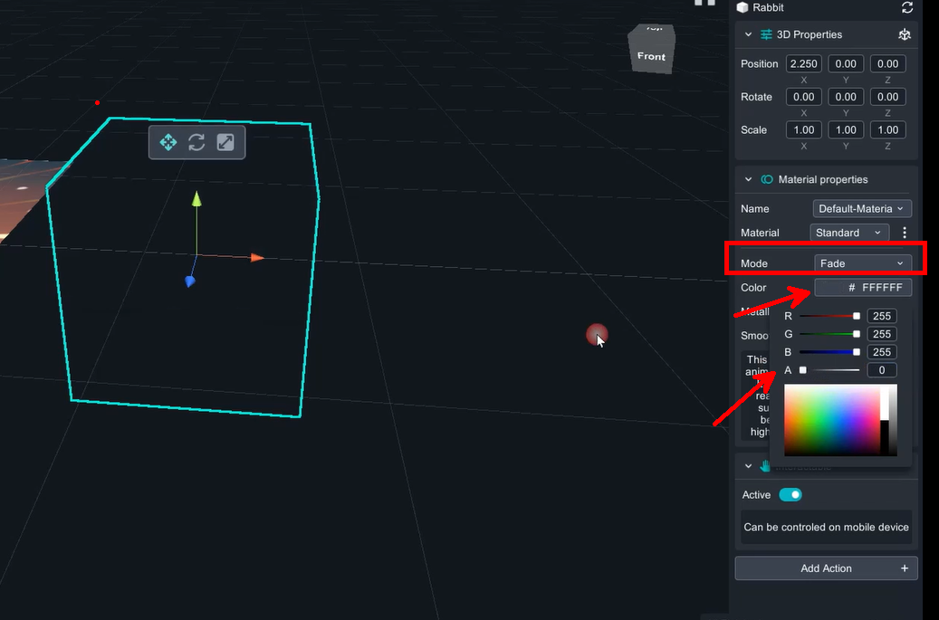 Transparent cube: Click the three dots on the right side of the material ball, change the mode to "Fade”, click on the color, decrease the A (alpha) value to 0.
