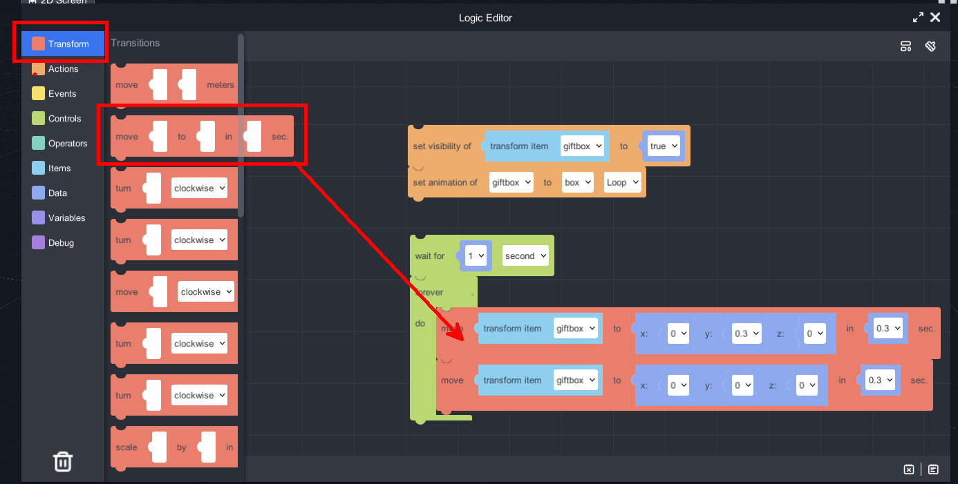Blockly code: Transform 🡪Transitions 🡪Second block.