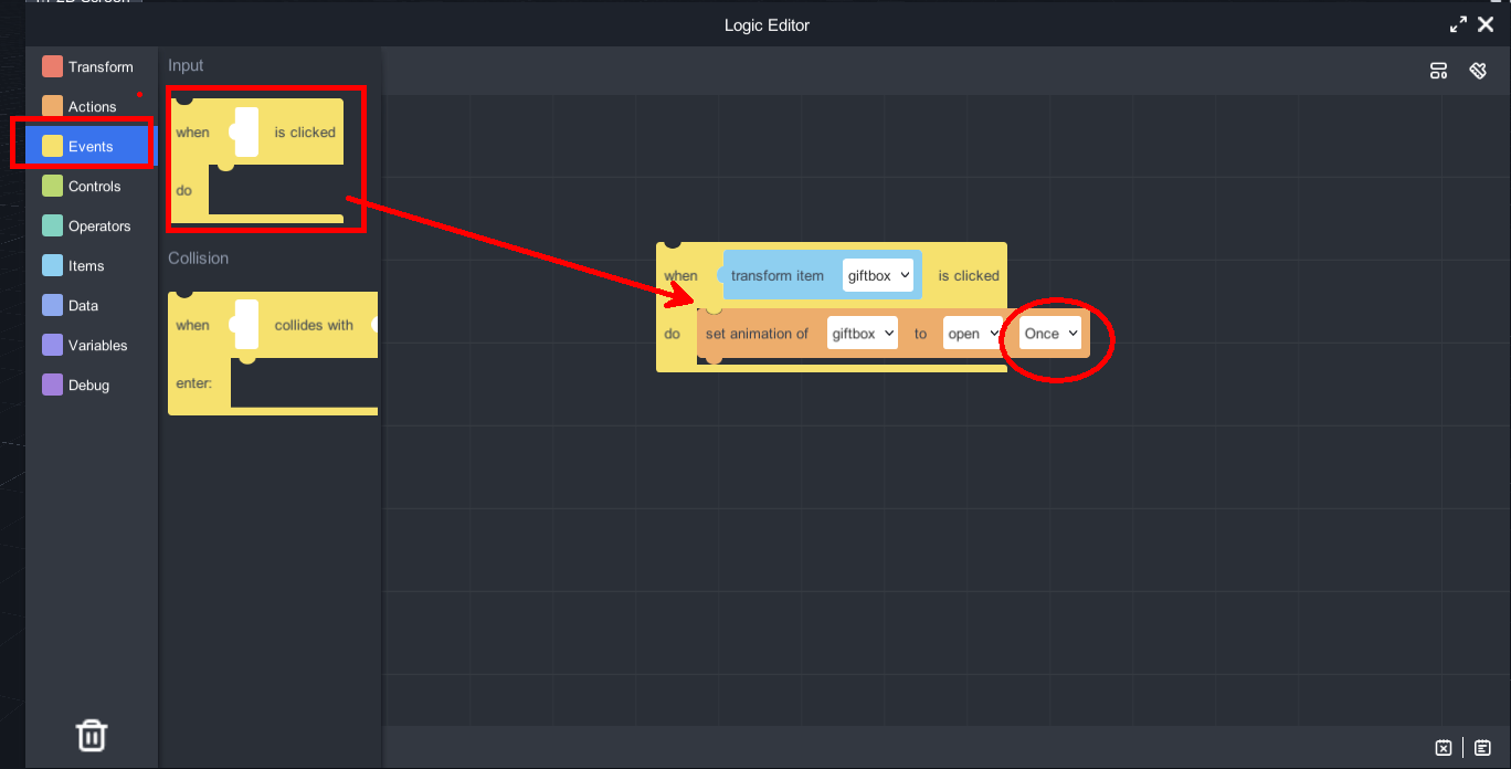 First, we need to create a trigger event, which will be clicking on the giftbox. At this time, the giftbox animation will change from "box" to "open" (this only needs to be executed once).