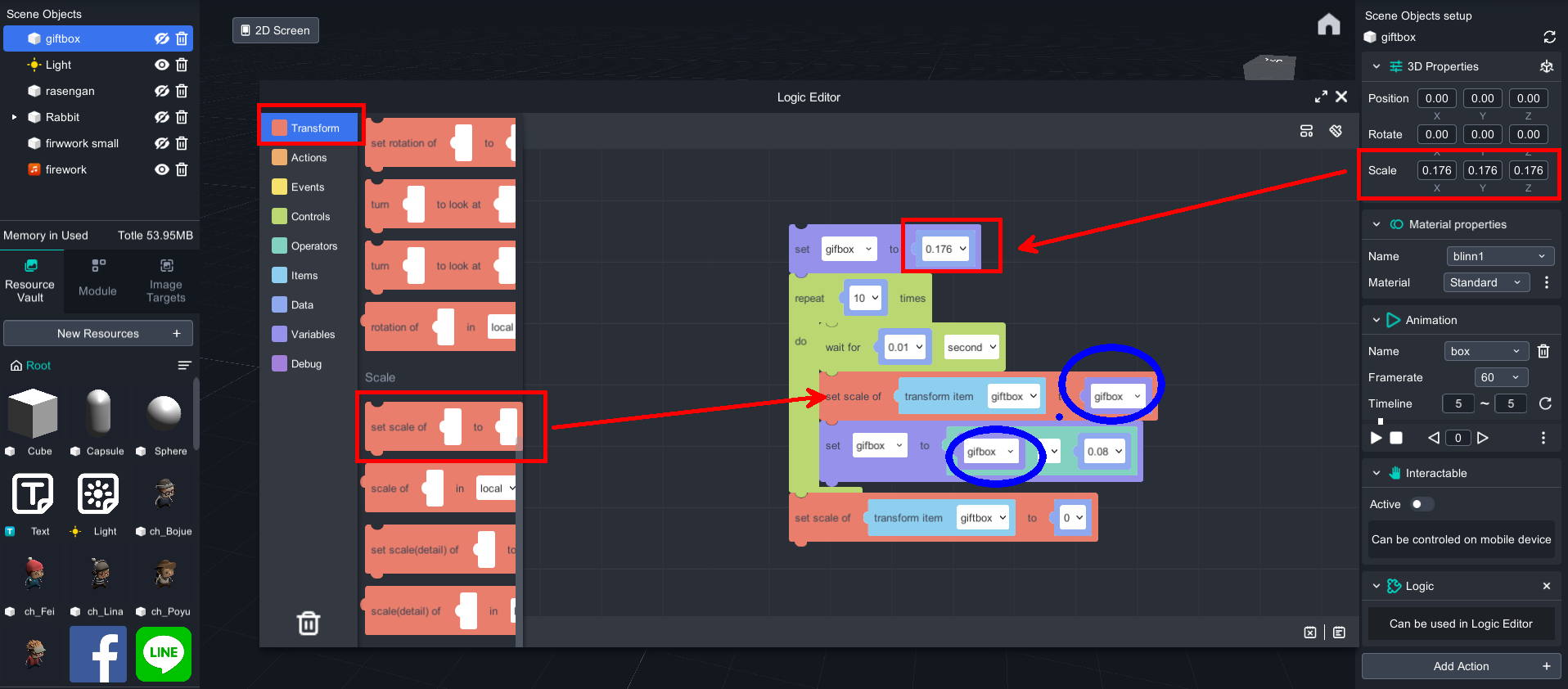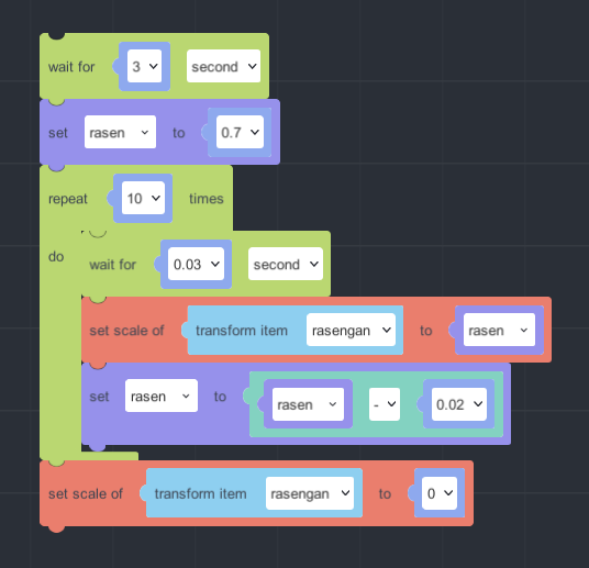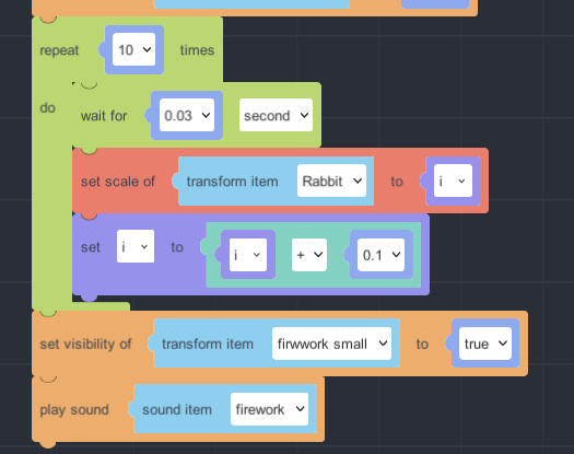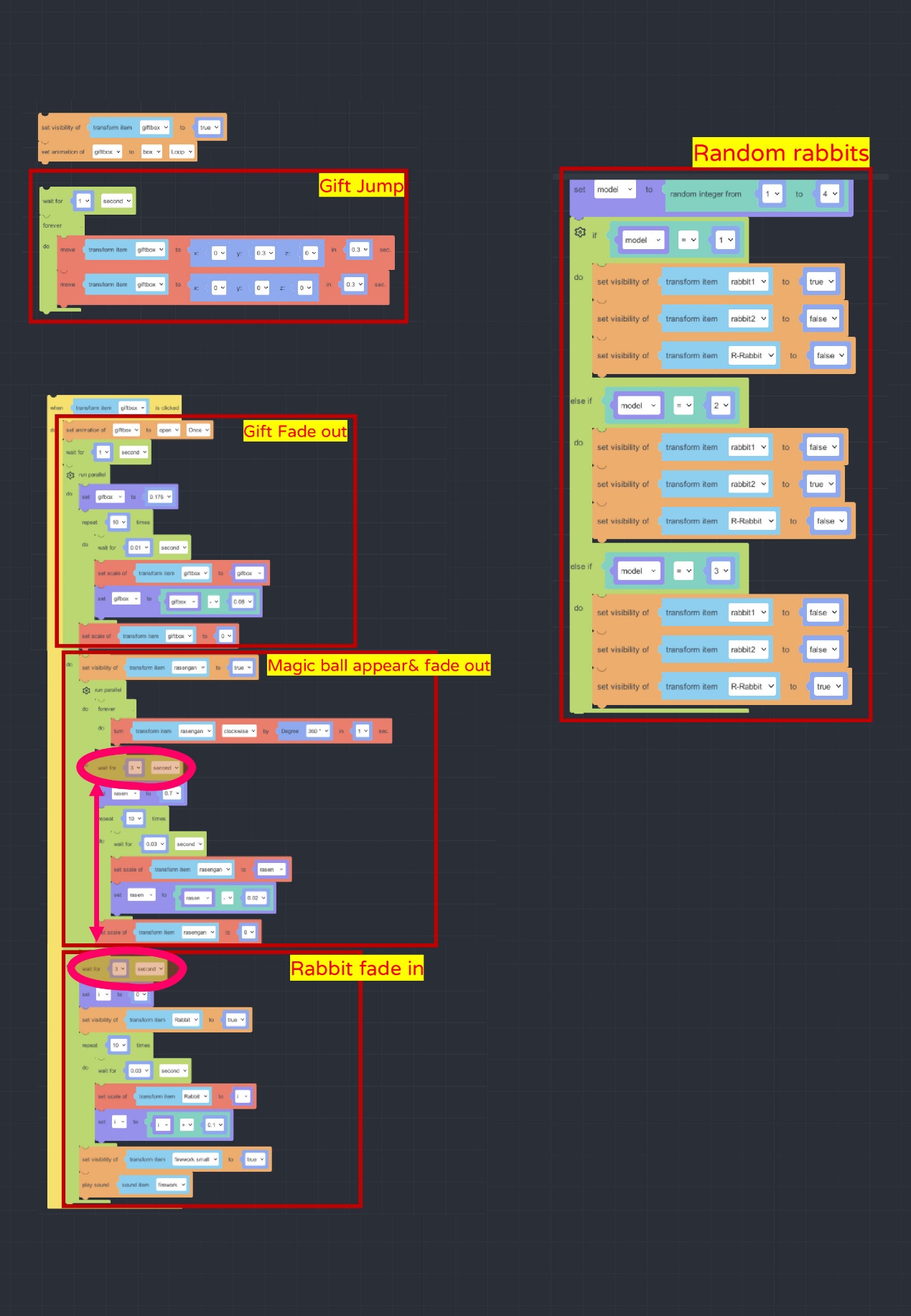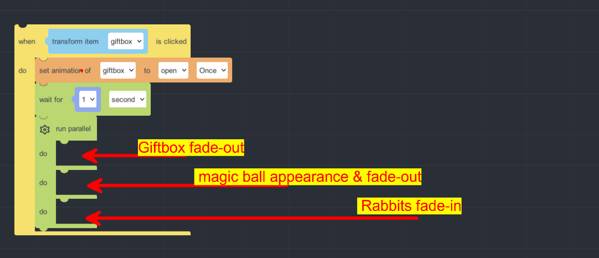 Next, three things happen simultaneously: the giftbox fades out, the magic ball appears and fades out, and the rabbits fade in. The logic program needs to achieve the fade-out effect (i.e., shrinking to no volume) and the fade-in effect (expanding from no volume to normal volume).