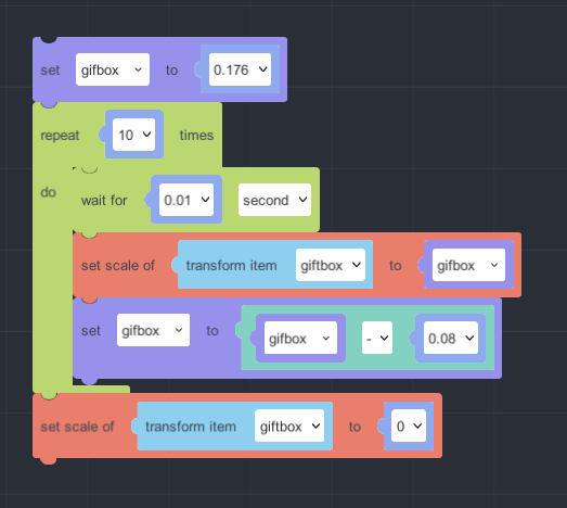 To achieve fade-out effect of giftbox, we need to set its value as "scale", and repeatedly execute the scaling down process for n times with a time interval of 0.01 seconds between each scaling operation. The scaling effect is achieved by using variable operations in the computer program's logic. Finally, we ensure that the volume is reduced to zero by forcing the giftbox's scale to be set to 0.