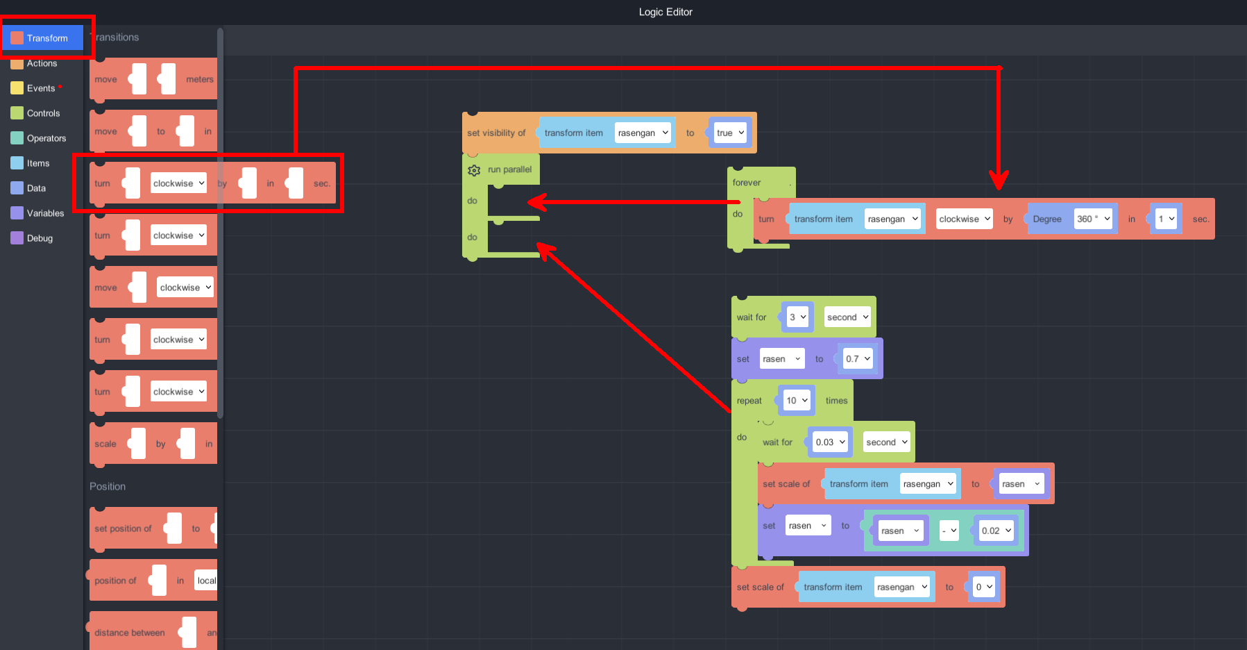 After appearing, keep the magic ball rotating and fade it out after 3 seconds. The fade-out module is the same as the giftbox, so it can be copied and used by changing the new variables and scale. In addition, rotation and fade-out are connected using parallel operations.