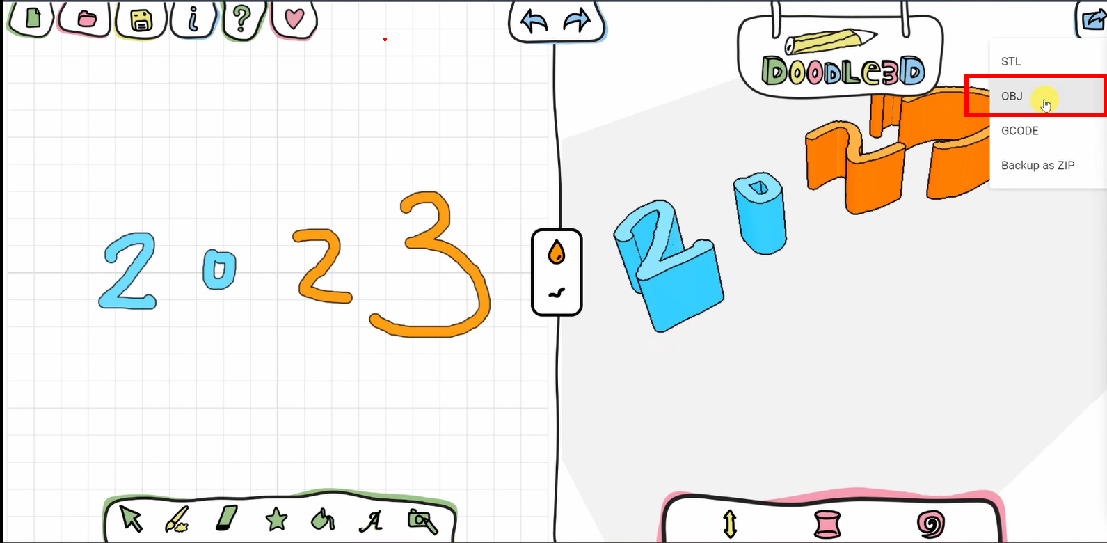 This is a web-based modeling tool. The left side displays a 2D canvas while the right side shows a 3D space. You can draw any shape or write any text on the canvas on the left and an equivalent 3D model will immediately be generated on the right. The models can be saved in STL and OBJ file formats. Therefore, I will use this tool to create my year's logo. By opening the website on a tablet, I can use a stylus to write in my unique handwriting font.