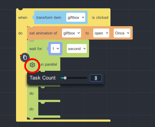 To synchronize the three actions of giftbox fade-out, magic ball appearance & fade-out, and, parallel programming can be used to link the three actions together. By default, parallel programming only has two tasks, but you can click on the gear icon in the upper-left corner to increase the number of tasks.