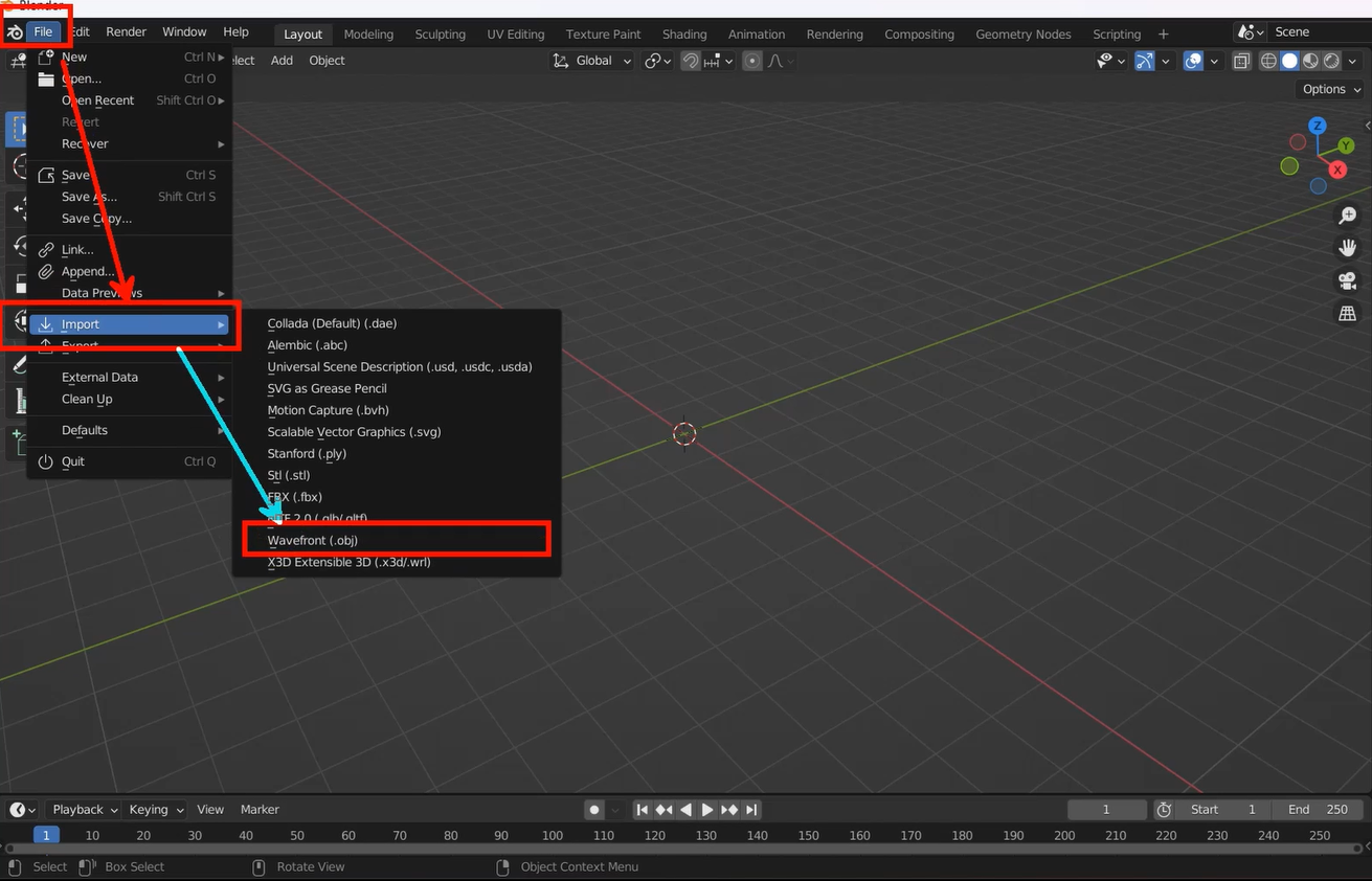 To import the file, go to File 🡪 Import 🡪 Wavefront (OBJ).