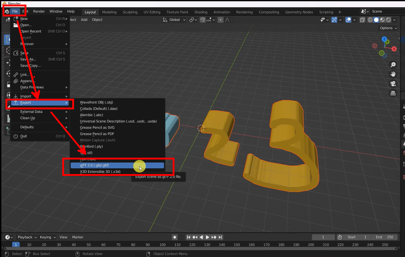 To export the file, go to File 🡪 Export 🡪 glTF 2.0 (GLB/GLTF).
