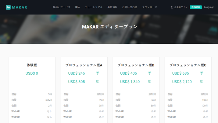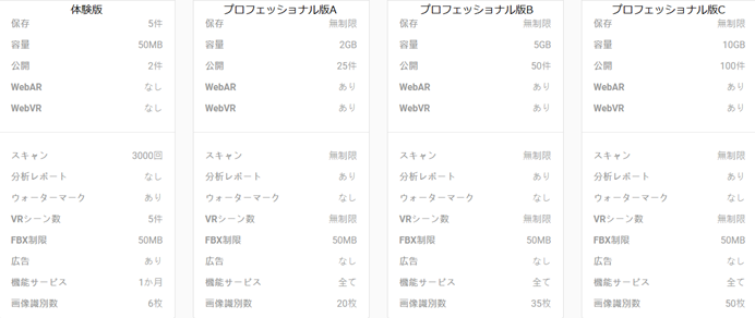 • 体験版:使用者は手軽に体験して2個AR/VRプロジェクトを公開することができます。スキャン数は3000回を含めています。