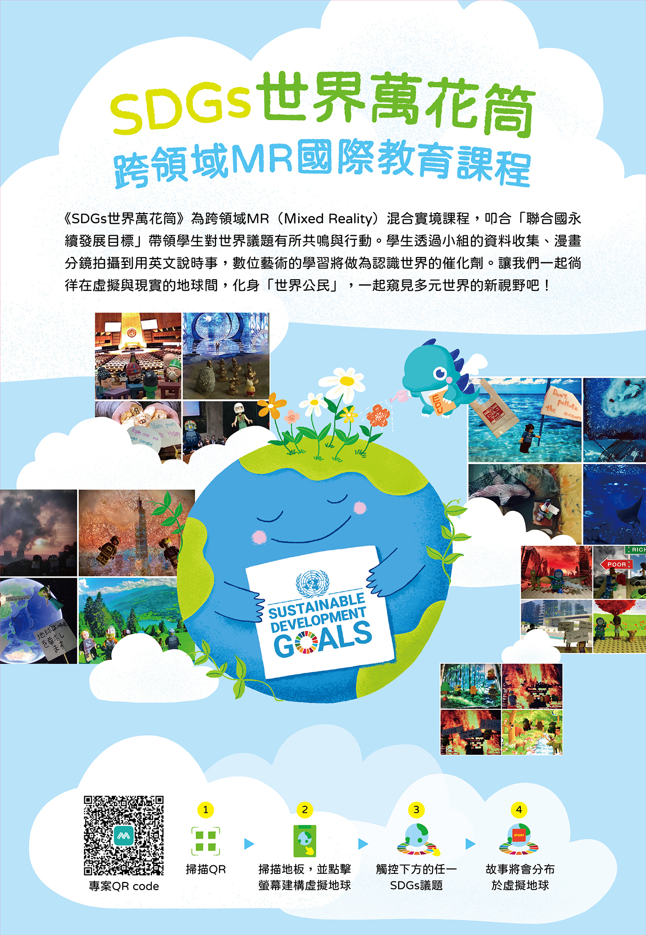 「持続可能な開発目標」を目指して、学生たちは世界の議題に対して共感できるため、グループを作って資料を探したり、漫画を描いたり、英語で録音した。デジタル芸術の学習は促進剤として世界を広く認識できるツールだ。今、早速アプリを体験して、仮想と現実の地球の中に「Global Citizen」として一緒にこの多様な世界を見てみよう!