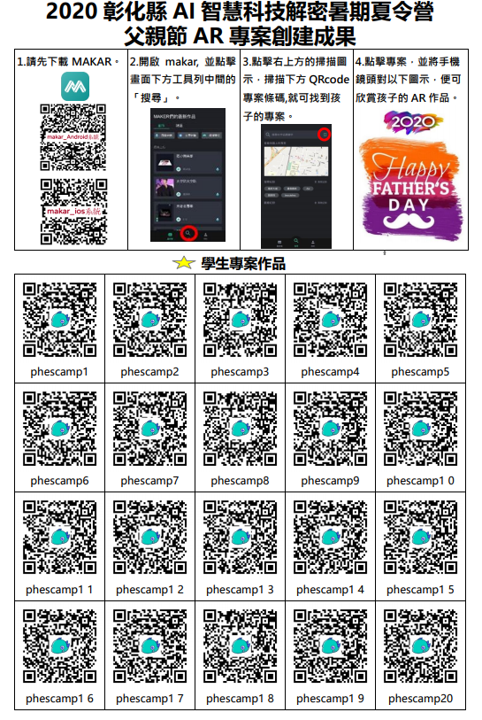 彰化的AI夏令營特別加入了最新科技AR項目,讓學齡兒童能提早接觸到隨著5G到來將會產生科技革命而流行的AR技術,小朋友使用MAKAR 編輯器,使用者友善介面及簡單上手,兒童們沉浸在對科技的好奇心及發揮創意淺能的熱情。