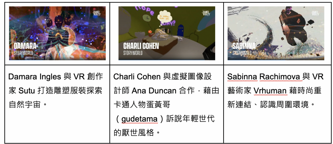 來自《The Fabric of Reality》時裝秀的內容多為展示創作者故事及作品,透過VR技術及5G的即時性提供3D作品,喜歡時尚的朋友可以直接可戴上VR裝置,不用去到倫敦時裝秀就能在VR空間中探索互動設計師作品,這個時裝秀提供試穿秀服,還能觀看到平時秀場後台是如何運作的,讓民眾對時裝秀有更深的了解及滿足每個人都能站上時裝舞台的願望。