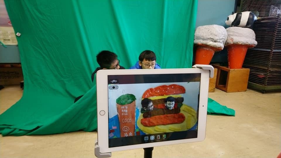 在食破天驚的專題課程,利用綠幕去背棚拍結合AR擴增實境,讓參與課程的六年級孩子們跑進自己以複合媒材創作的美食圖像中去大玩特玩,彷彿是被縮小燈照到後,跌入湯碗中、變成漢堡餡,或是被關進牛奶瓶裡,每個人都盡情展現自己的創意與表演欲,用最獨特又爆笑的視角和自己的美食互動著。