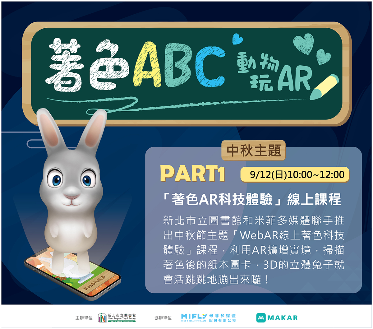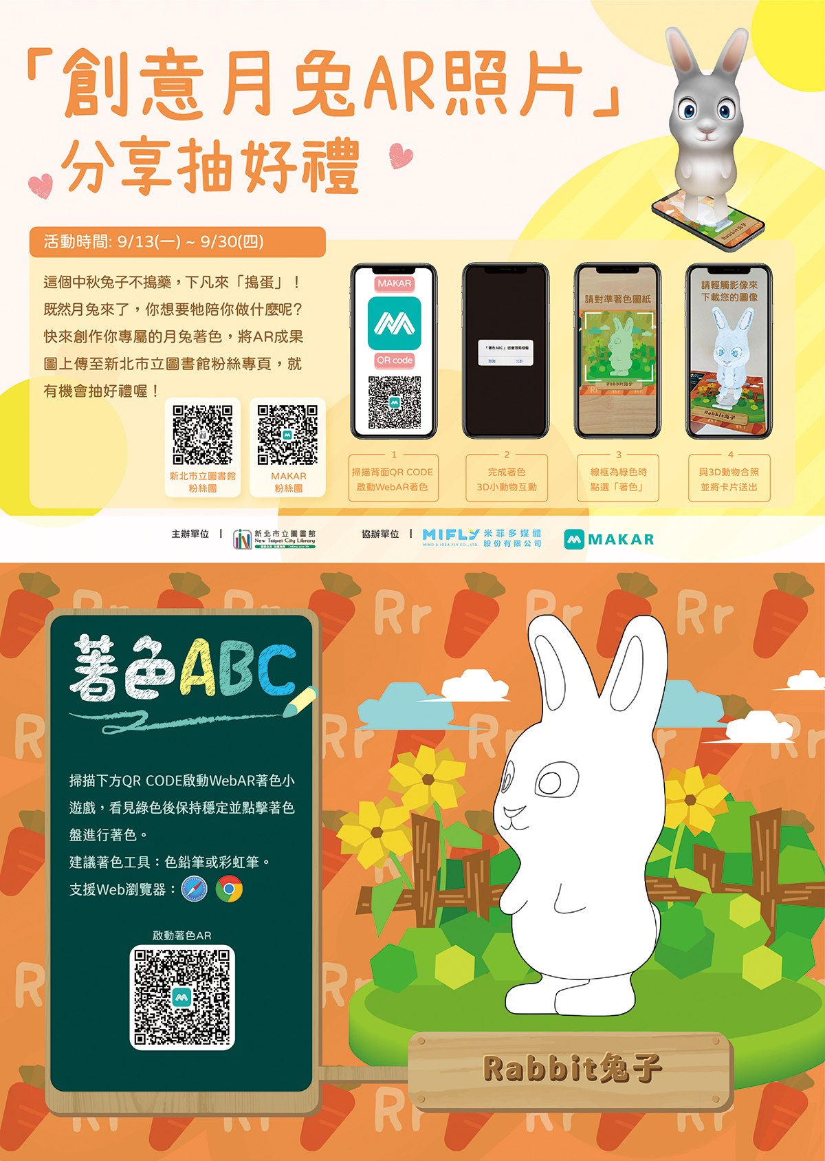 活動說明:透過Web AR技術,繪製的圖卡直接掃描左方的QRcode,便可以開啟擴增實境體驗。月兔AR著色卡特別結合兔子英文─Rabbit─ 「R」的設計,按下聲音按鈕,就可以學習英文發音!透過活動,引導孩子加以學習如何應用AR科技。除了觸發Rabbit發音,還能360度旋轉兔子,並且拍下跟3D月兔的合照,一起慶祝中秋節!