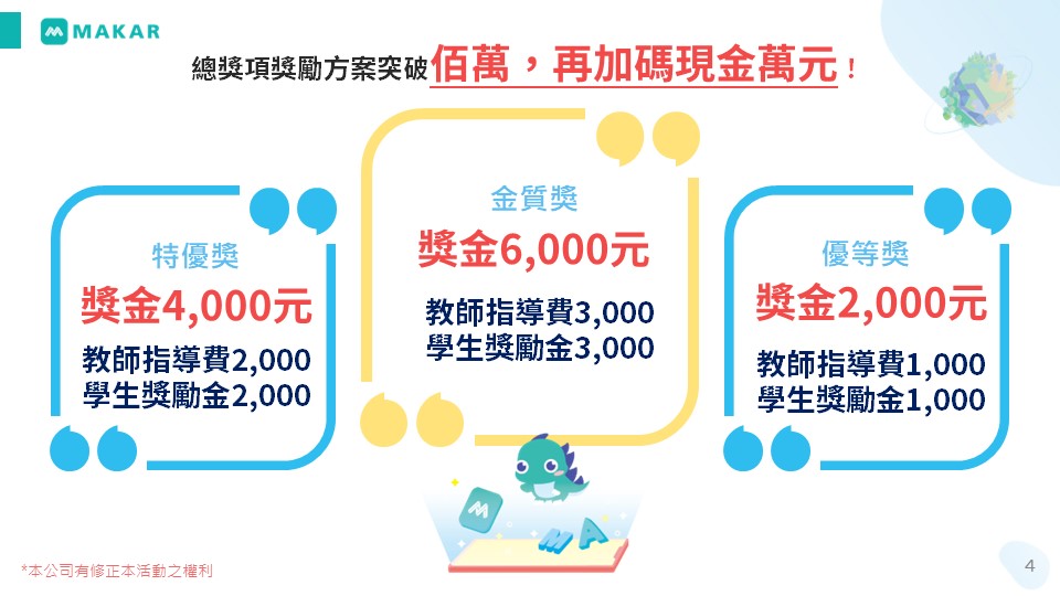 -特優獎:獎金共肆千元,教師指導費2,000學生獎勵金2,000。