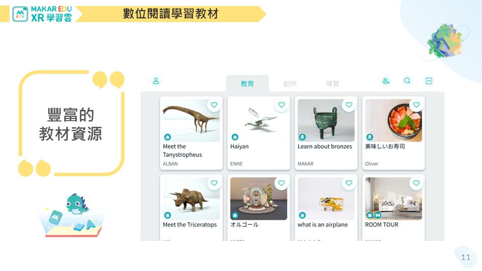 | 創作教材 | 可應用MAKAR XR Platform進行數位內容創作,並發布於MAKAR EDU中進行數位內容進行導覽或自主學習。 |