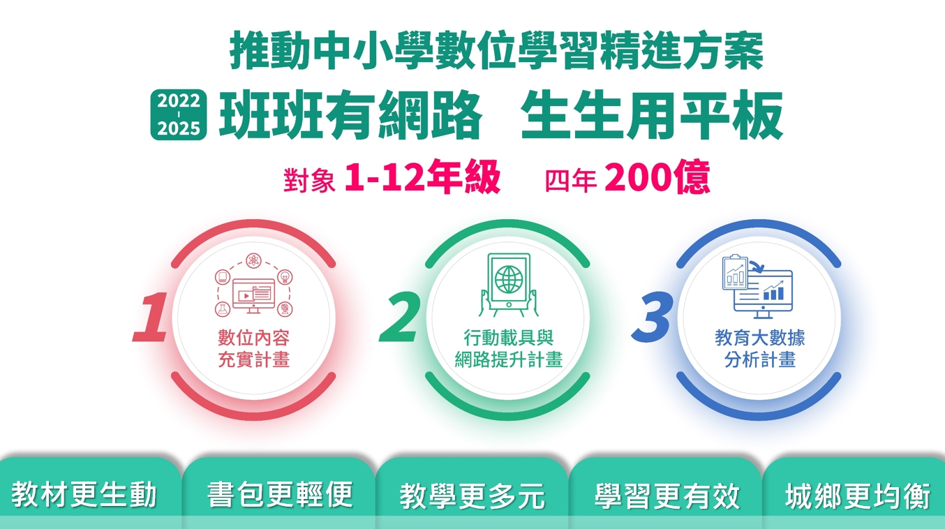 行政院於去年底(2021)宣布「生生用平板」計畫,為加強學生數位科技應用能力,熟悉數位學習平臺、工具與資源使用,並運用數位學習平臺培養自主學習能力,本院推動中小學數位學習精進方案,可縮減城鄉數位教育落差達公平教育的目標,並於疫情期間可支援經濟弱勢、多子家庭學生有學習載具可使用。