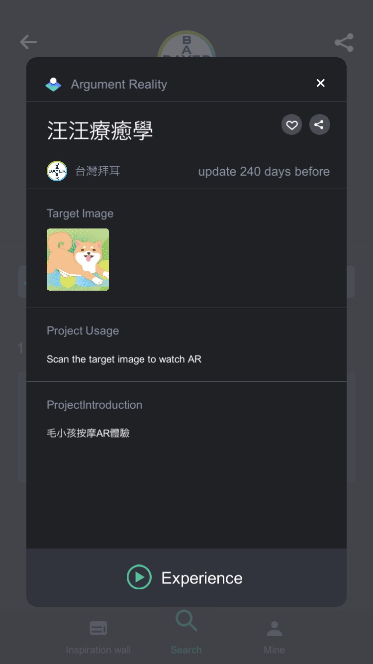 點開體驗,再掃描平面的狗狗圖案,便能看到眼前出現立體的狗狗肌肉、骨骼細部示意圖以及相關教學影片。