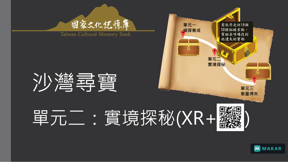 2. 操作本團隊的〈沙灣尋寶VR〉專案,進入VR世界,由虛擬角色文藝社社長小曦和副社長阿倫帶玩家到沙灣進行校外教學場勘,認識沙灣歷史梗概及遊戲任務,並約定實境探秘日期。