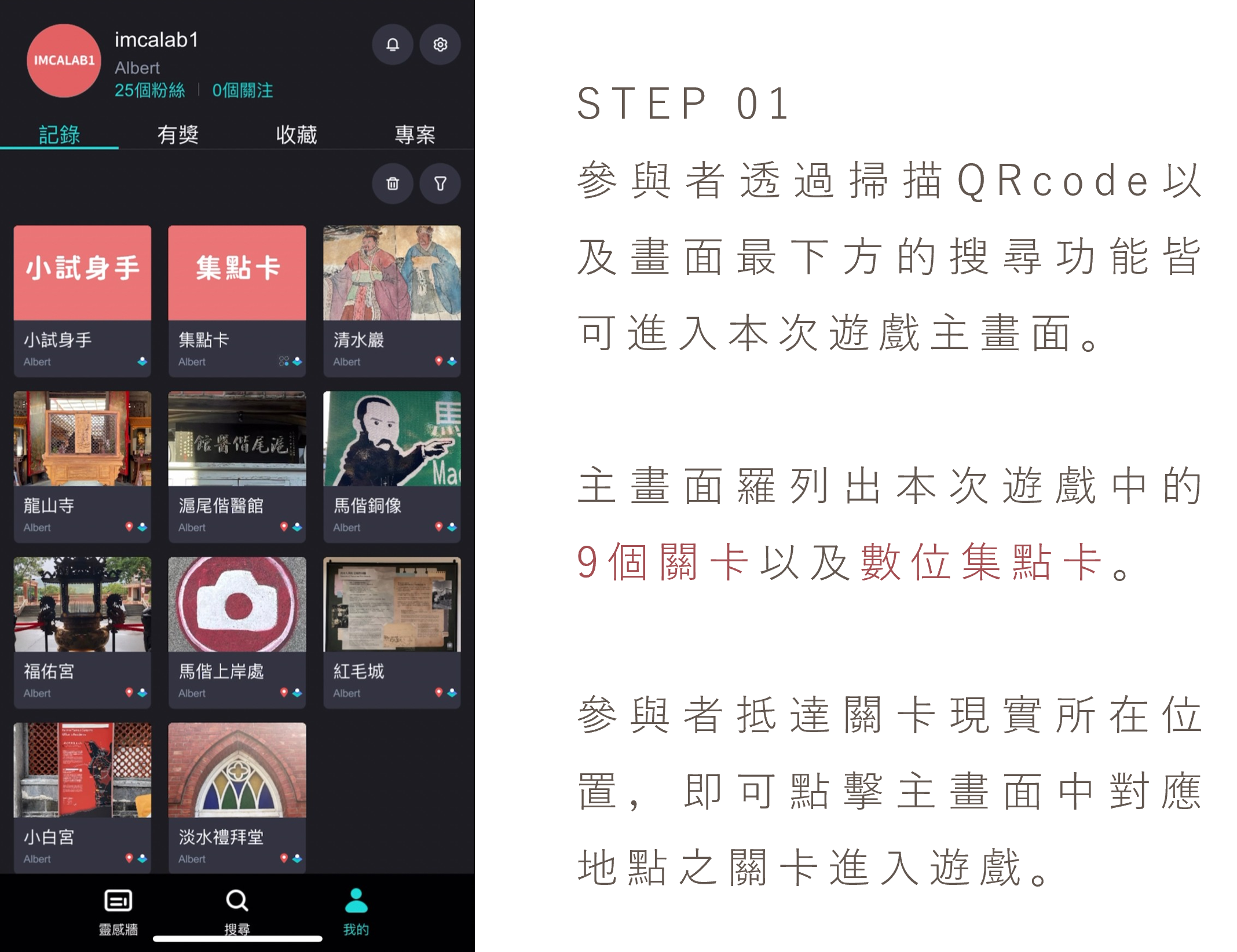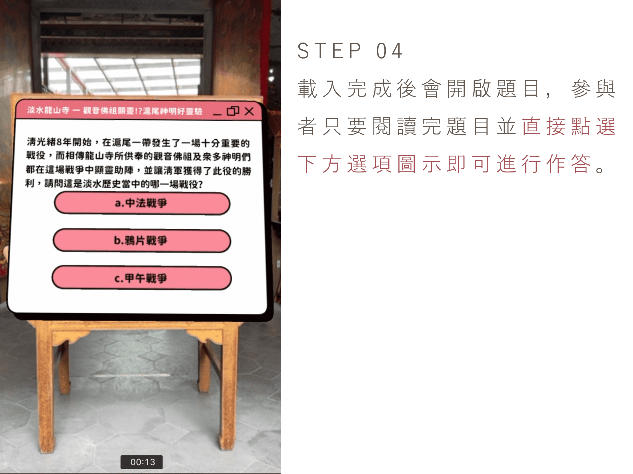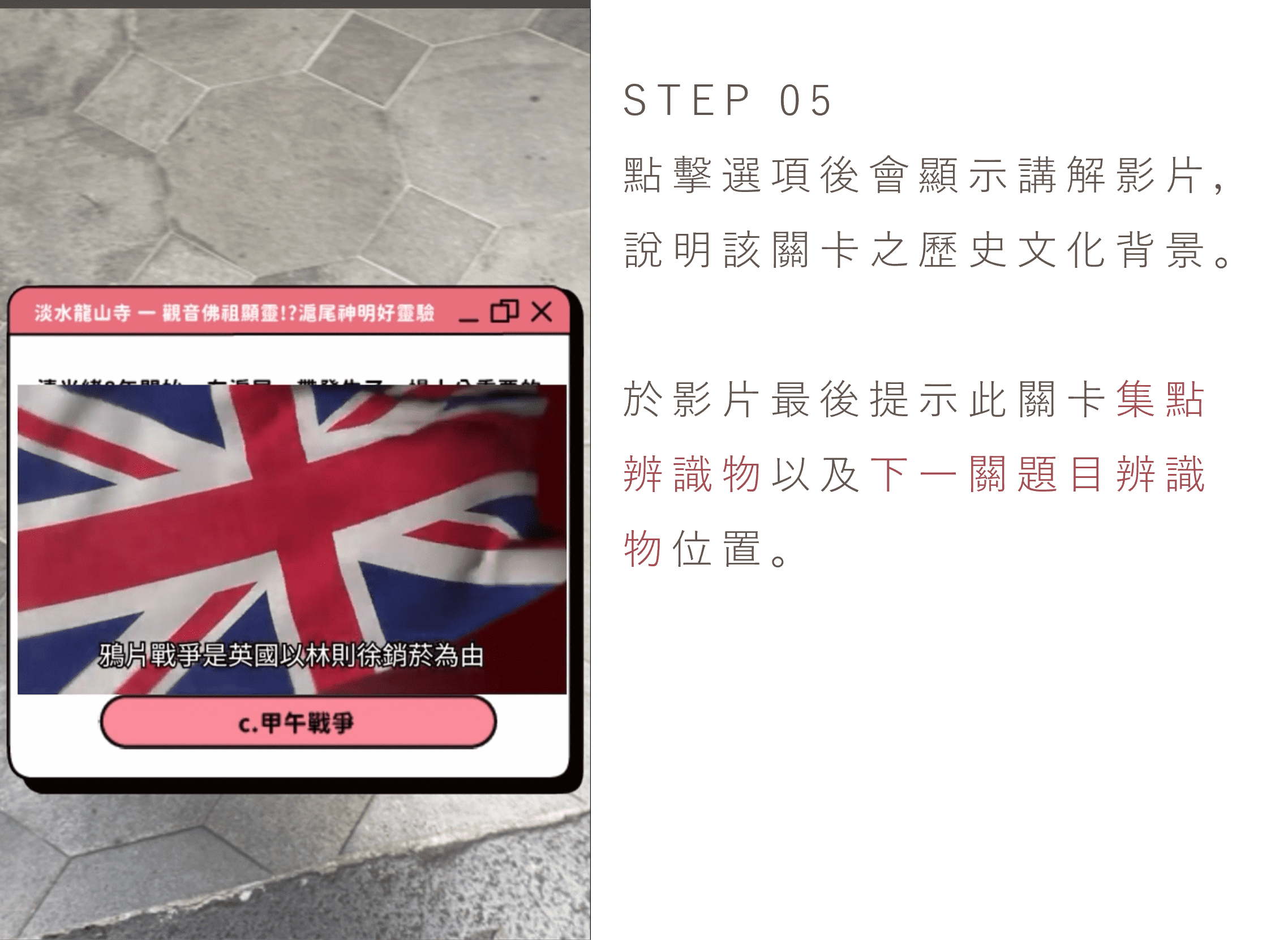➣ 體驗方式:本遊戲以個人為單位,透過以選擇題為主,影片、集點卡為輔,共有9個關卡,分別為清法戰爭支線與馬偕支線,清法戰爭支線由淡水龍山寺、淡水清水巖、淡水福佑宮、小白宮與紅毛城構成,馬偕支線由馬偕銅像、馬偕上岸處、滬尾偕醫館與淡水禮拜堂構成,遊戲參與者將前往淡水的九個歷史古蹟景點,透過掃描辨識圖開啟答題活動,讓他們在遊玩過程中對於淡水歷史景點之文化與發展有更進一步的認識。