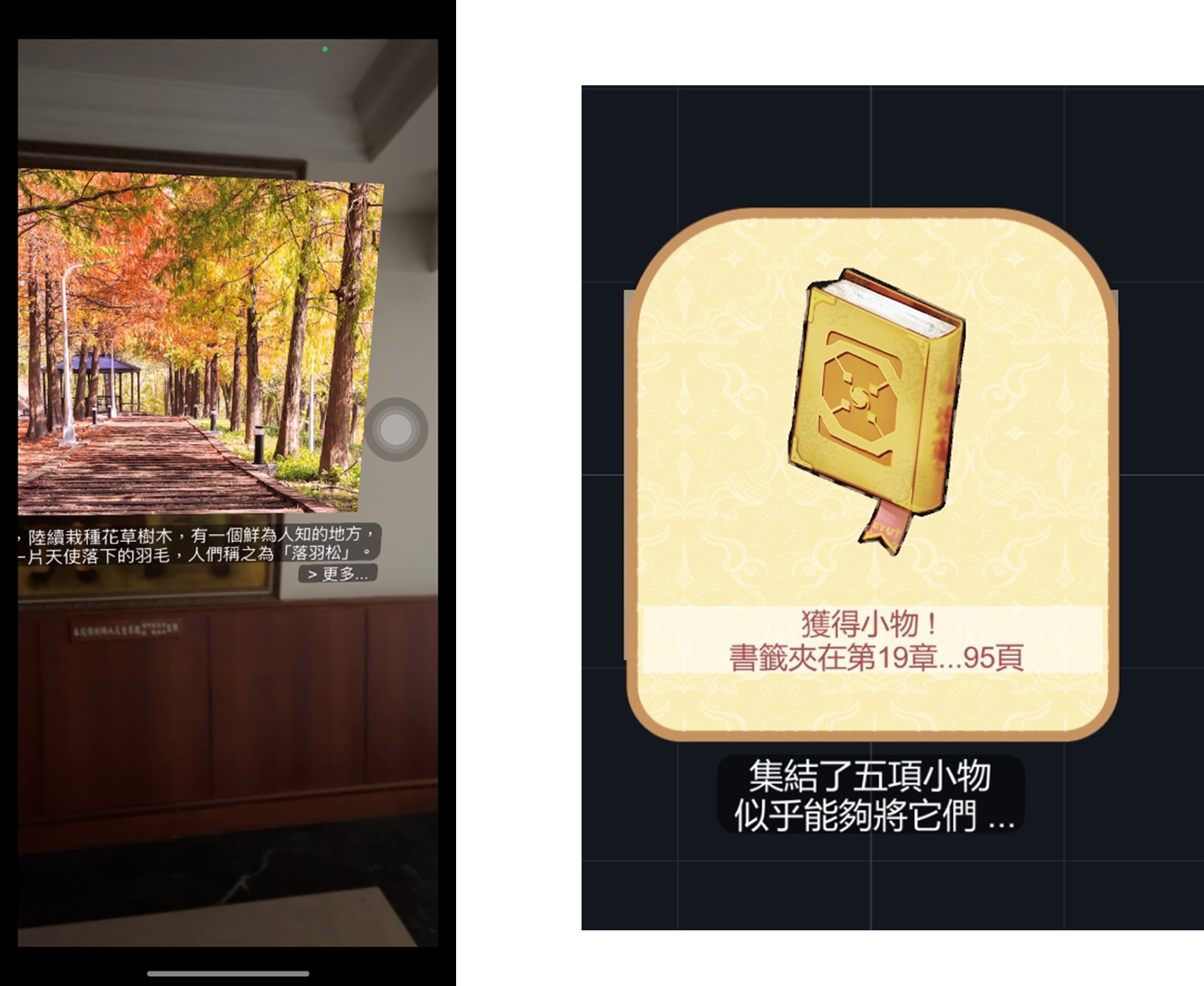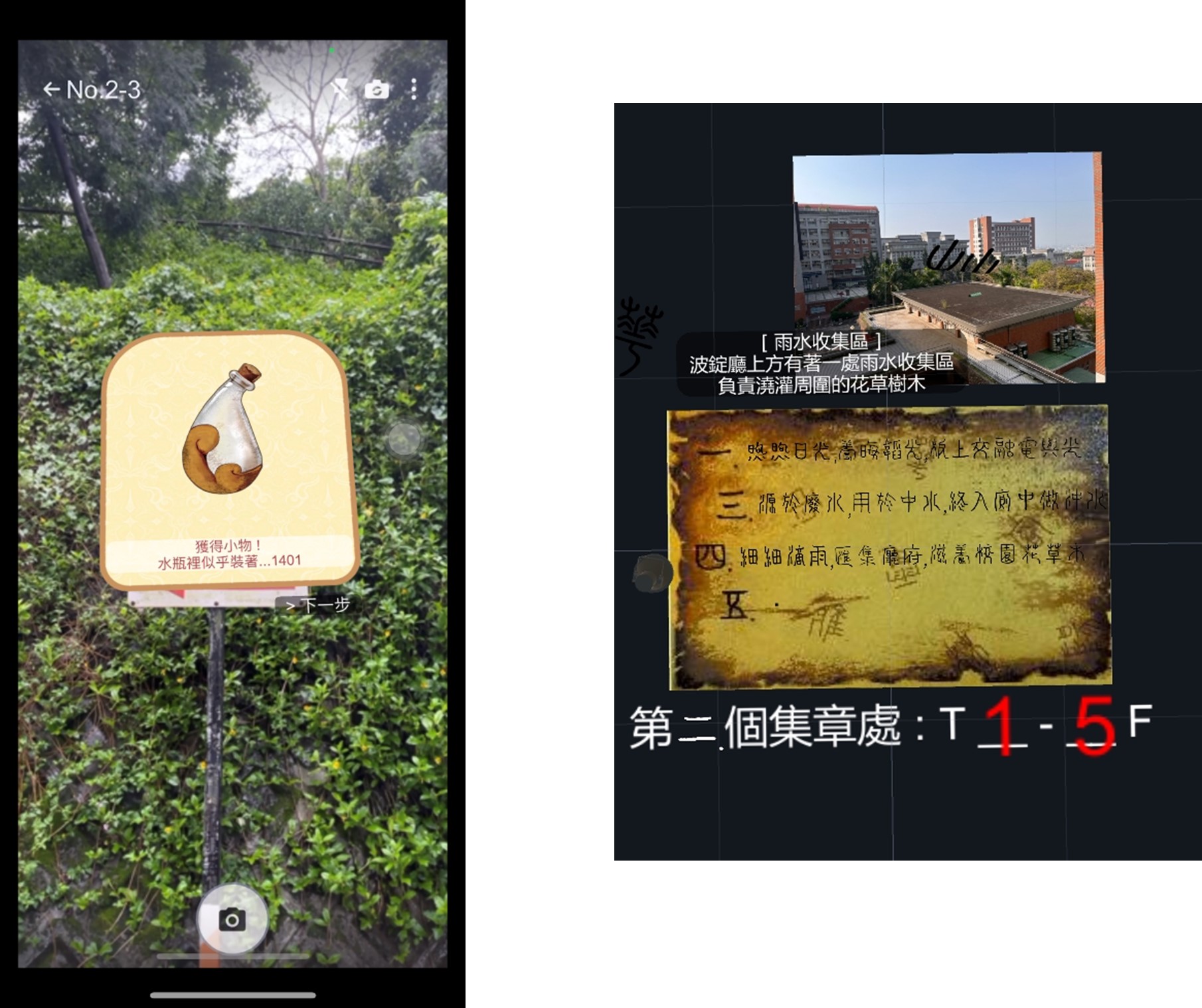 l 第一環節:上一關結束後,便有小提示提醒同學打開卷軸機關,獲取「古體字」掃描後便會出現校園當中許多的綠色能源設施,呼應上一關的主題,也對校園永續有更進一步的認識。