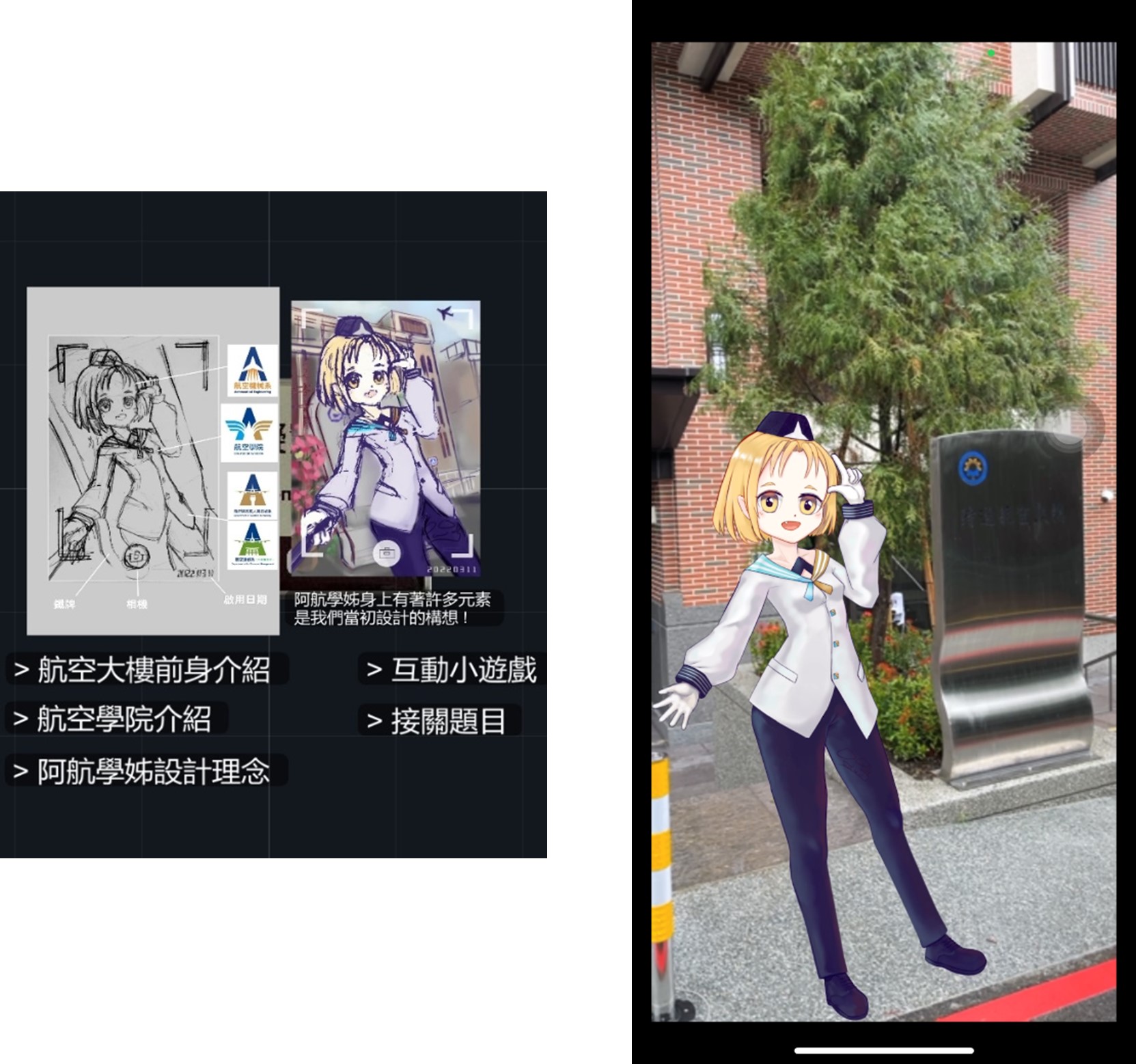 l 第一環節:此關主要在介紹校園中最新成立的「航空學院」。團隊設計出虛擬人物「阿航學姐」和同學們近距離互動。同時也呈現社團辦公室的校園歷史。本關設置三道問題,同學們須回答問題才可得到提示往下一關邁進。
