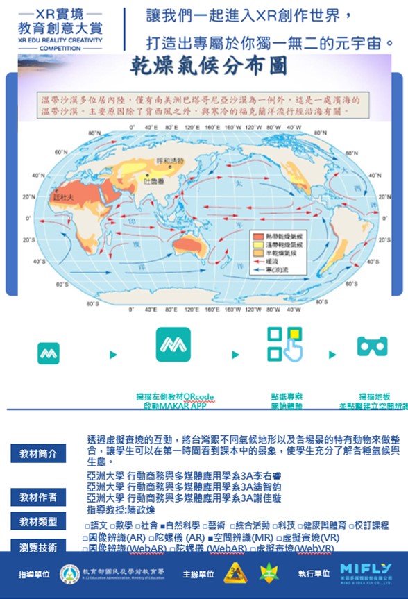 ➣ 本作品從台灣黑熊的位置出發,透過與地形中的環境角色作為互動,瞭解該地形的雨量圖及簡單地理環境介紹。學生能透過劇情互動內容結合AR/MR,以及讓學生們能夠看到地形就能聯想到該地形的氣候。