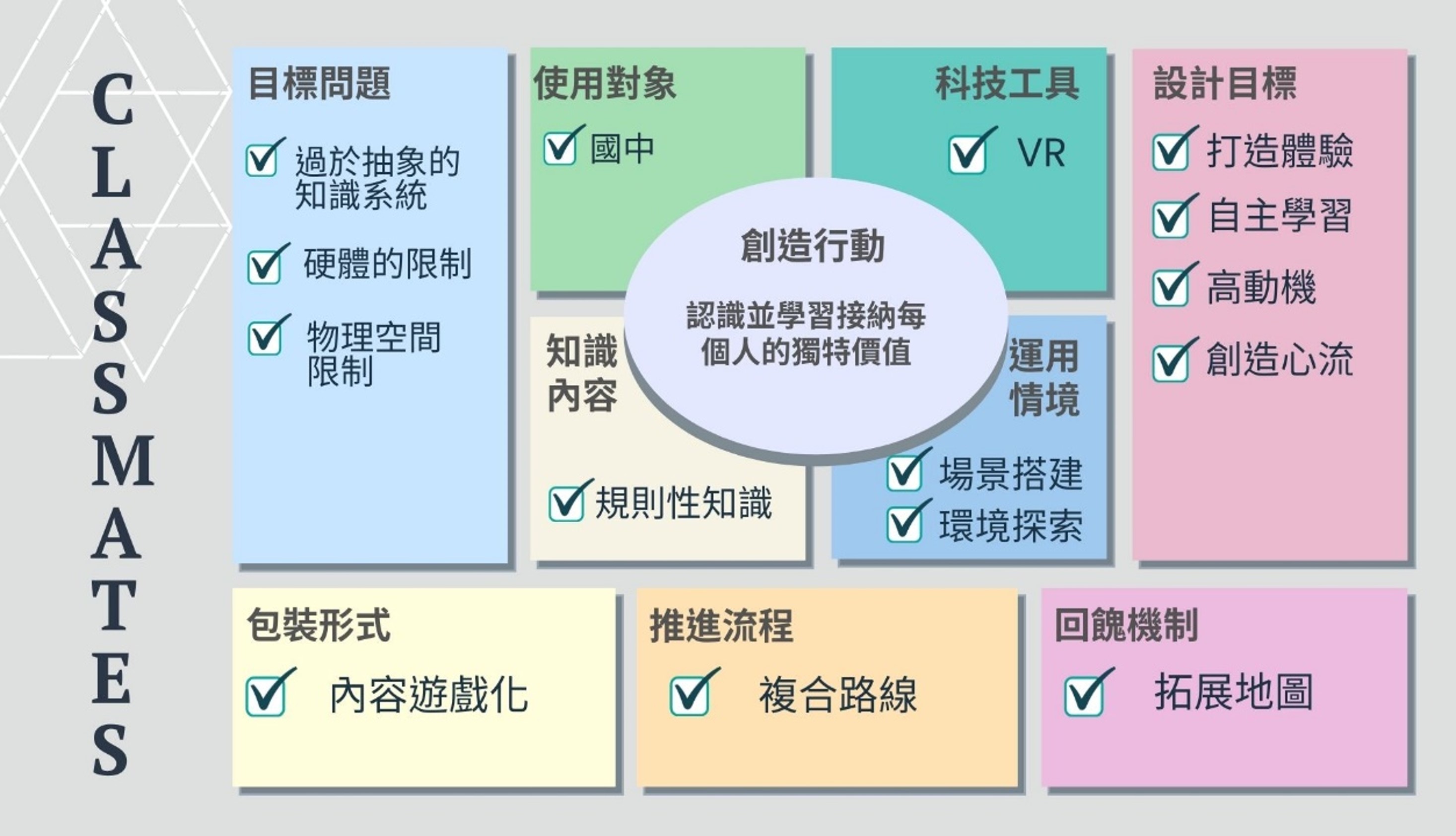 生命與情感教育所涵蓋各類型的重要議題:自我探索、自我認同、性別及性教育、網路霸凌等各式多元議題,急需要有更多創新的思維投入於議題式體驗課程教材的設計與研發。本次專案嘗試打造一個架空故事下的班級霸凌的情境,帶玩家去探索這間教室裡所發生的事件,並引導至自我接納與自我認同的核心議題。