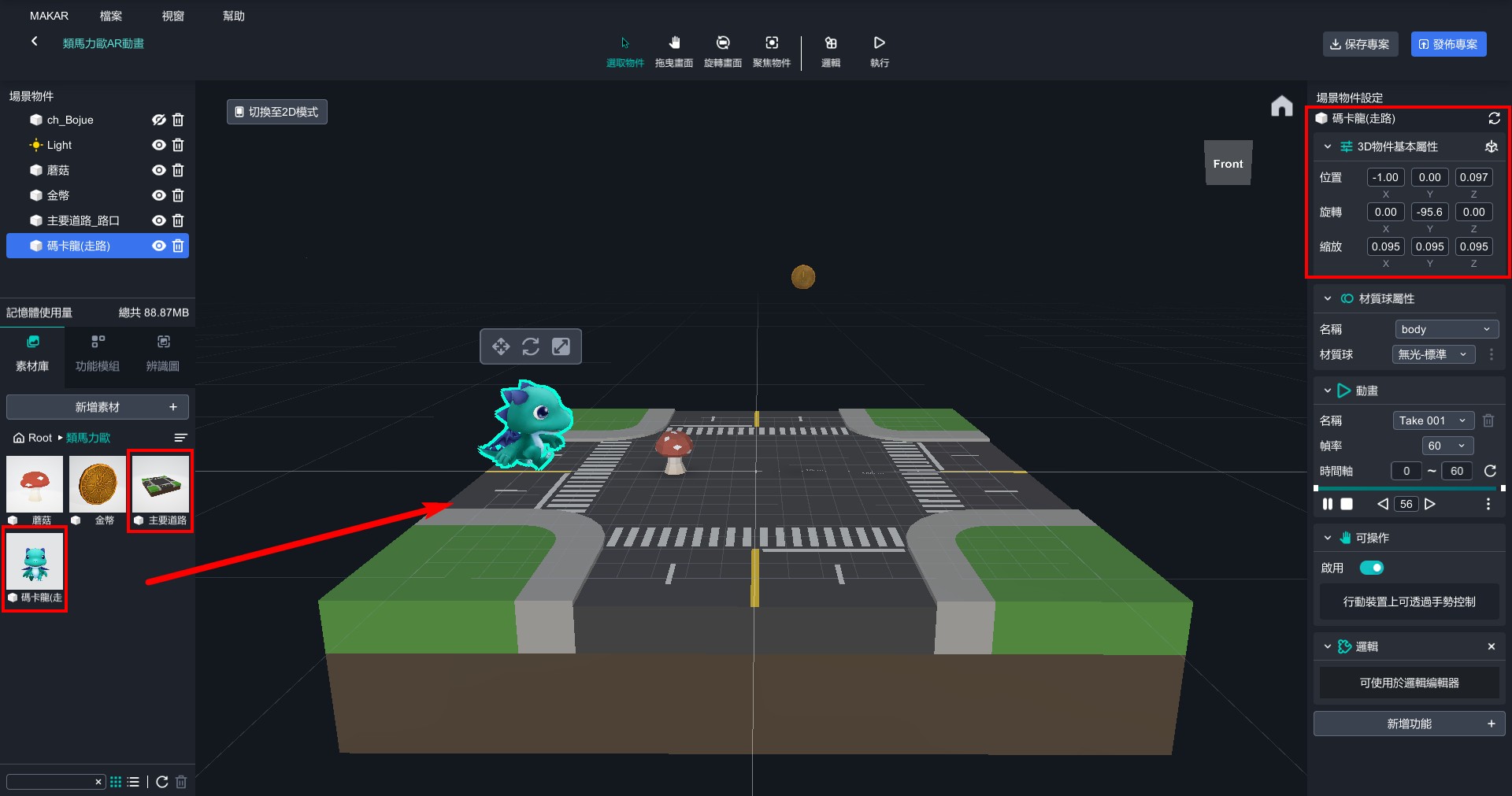 1. 將道路和碼卡龍拉到編輯器中,將碼卡龍轉向。