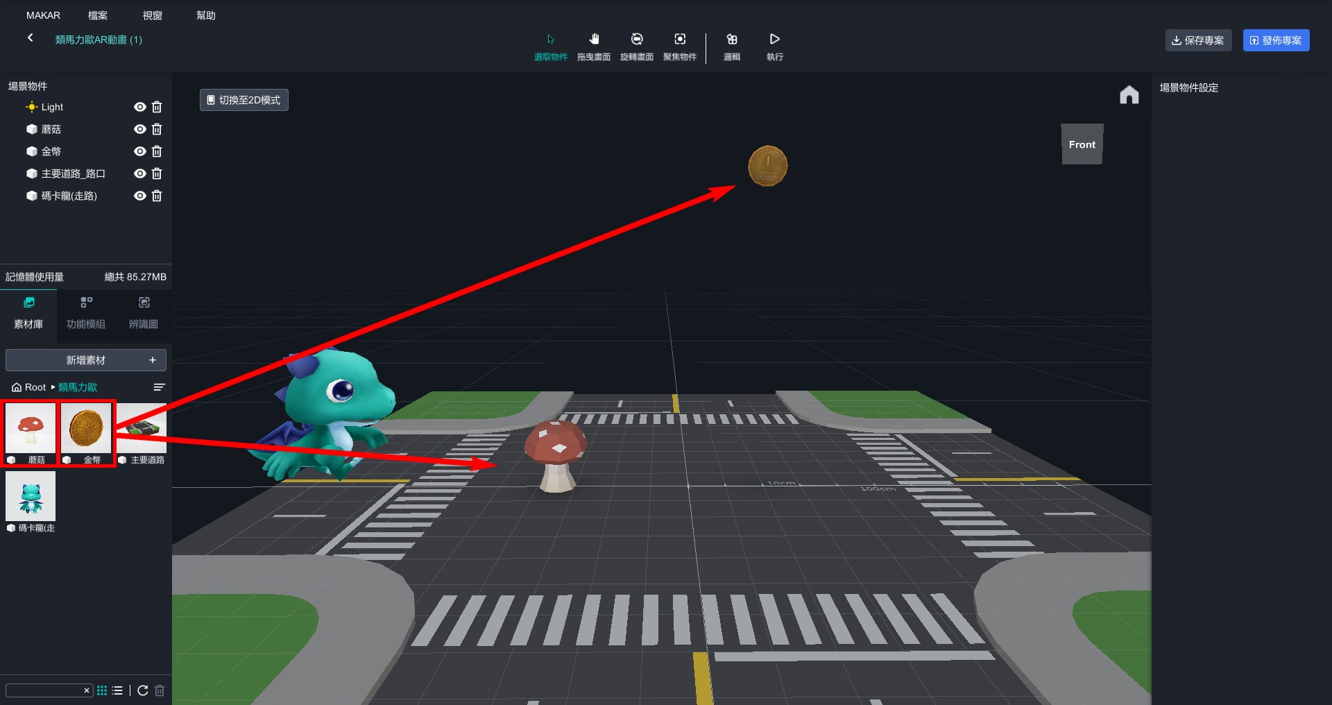 1. 將蘑菇和金幣拉到編輯器中,並取得適當的距離。