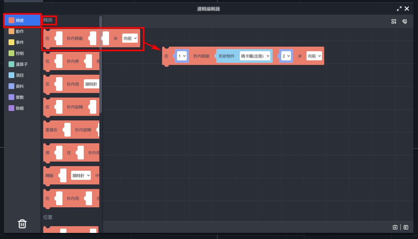 1. 從「轉變」>「轉換」,拉出「在…秒內移動…物件…米…」,接下來的動作都是以這個積木運行。