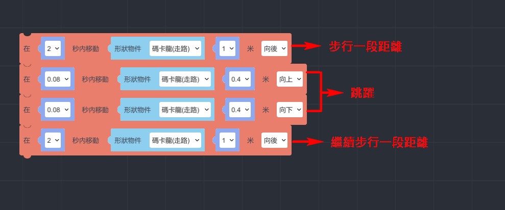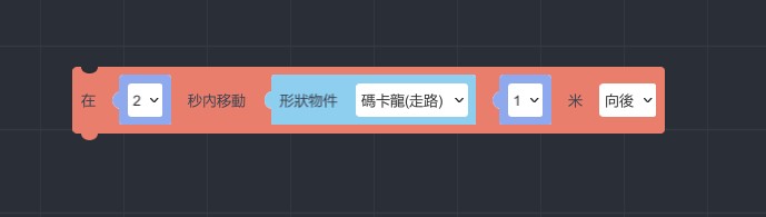 將積木設定「在1秒內移動 形狀物件碼卡龍(走路) 1米 向後」,雖然金幣從起始點算起位於1.3公尺的地方,但由於碼卡龍的身形較大,可將距離提前設定為1米後跳躍,看起來較為自然,可自行依照實際情況做微調。